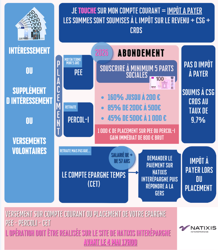 Si vous avez 57 ans et plus et que vous souhaitez investir tout ou partie de votre intéressement sur votre CET : Demander le paiement (via le site de Natixis Interépargne) et répondre ensuite à la GERS (campagne ouverte entre le 2 et 15 juin 2026).